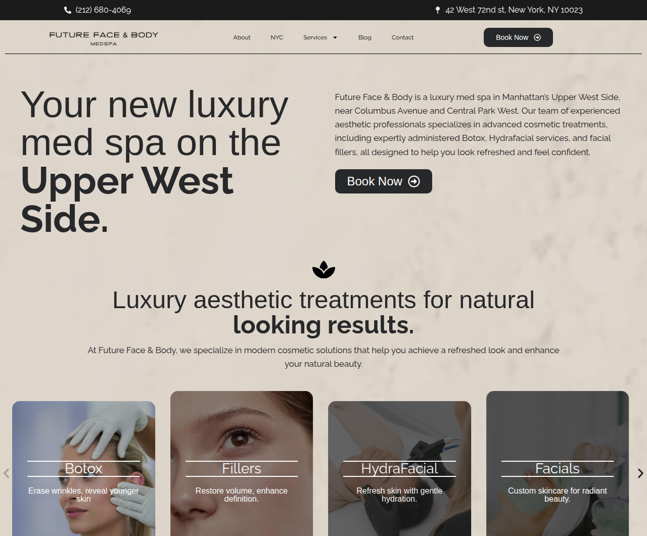Showcases medspa treatments and results while driving consultations through a clean, modern experience.